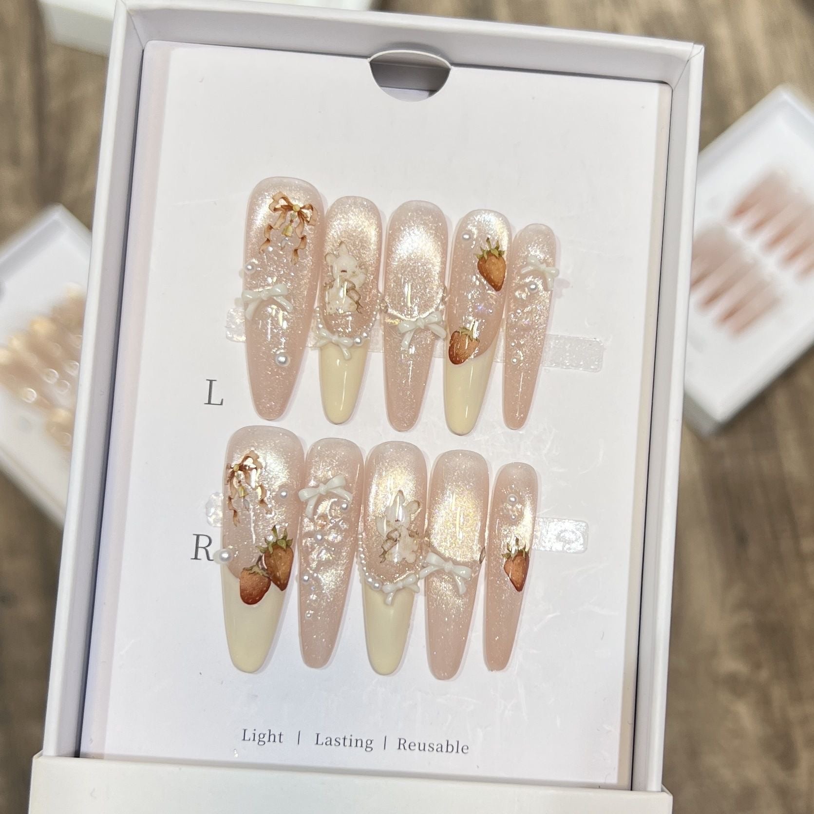 Our handmade press-on nails are designed to be reusable with proper care. After wearing them, you can remove them by soaking them in warm water until the glue on the back becomes soft enough to scrape off for the next application. As for gel tabs, they can be easily peeled off and are ready to be reused. With careful handling and storage, you can use your press-on nails multiple times and enjoy their beauty and convenience for an extended period.