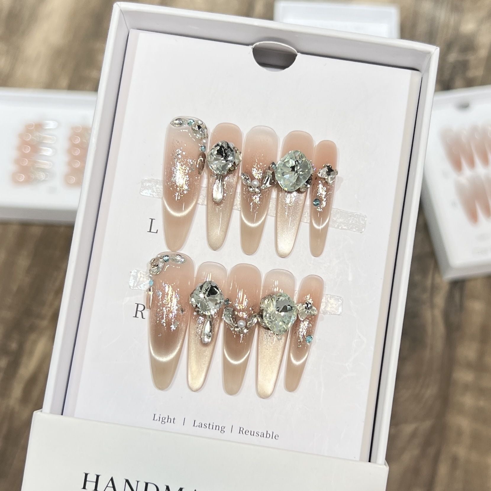 Our handmade press-on nails are designed to be reusable with proper care. After wearing them, you can remove them by soaking them in warm water until the glue on the back becomes soft enough to scrape off for the next application. As for gel tabs, they can be easily peeled off and are ready to be reused. With careful handling and storage, you can use your press-on nails multiple times and enjoy their beauty and convenience for an extended period.