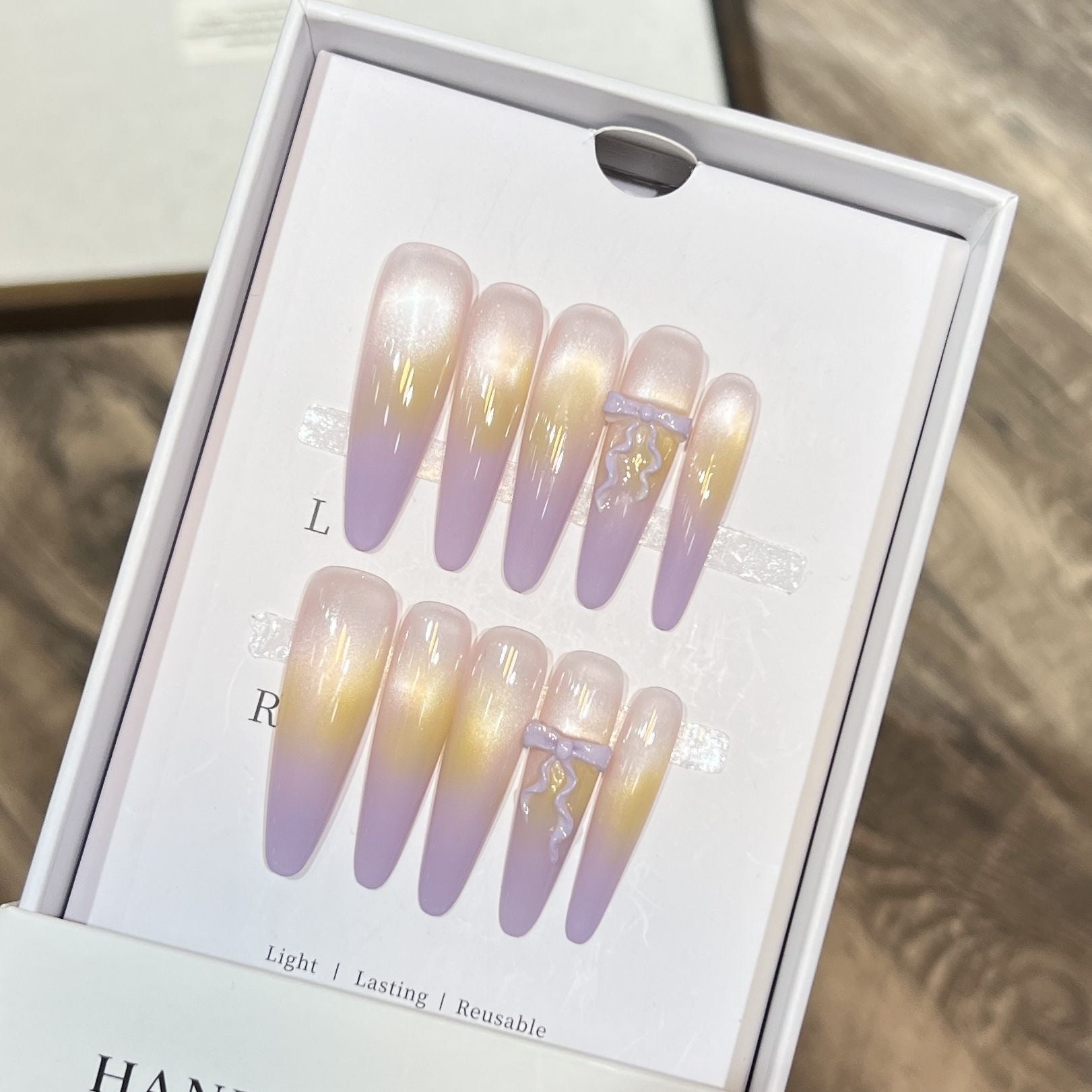 Our handmade press-on nails are designed to be reusable with proper care. After wearing them, you can remove them by soaking them in warm water until the glue on the back becomes soft enough to scrape off for the next application. As for gel tabs, they can be easily peeled off and are ready to be reused. With careful handling and storage, you can use your press-on nails multiple times and enjoy their beauty and convenience for an extended period.