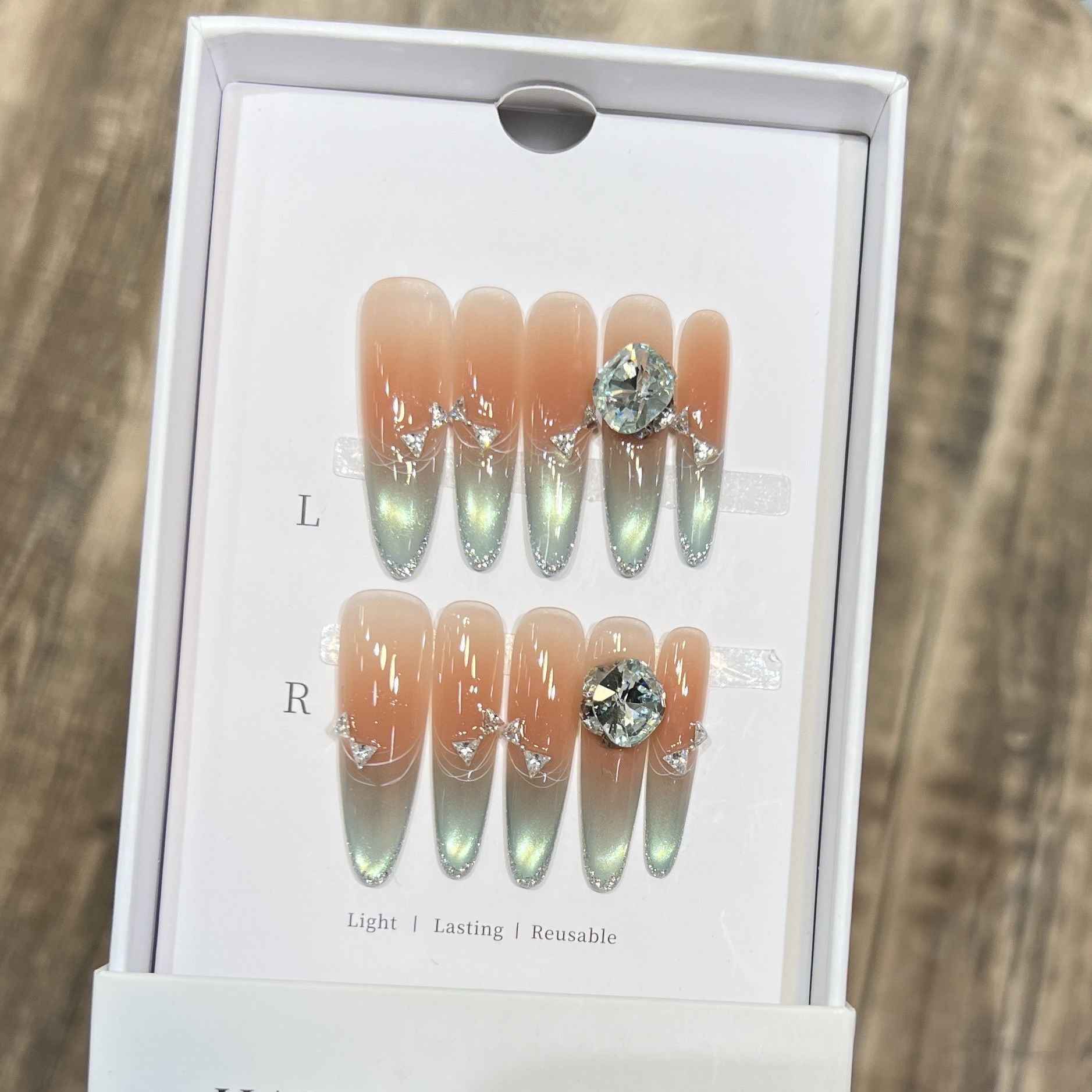 Our handmade press-on nails are designed to be reusable with proper care. After wearing them, you can remove them by soaking them in warm water until the glue on the back becomes soft enough to scrape off for the next application. As for gel tabs, they can be easily peeled off and are ready to be reused. With careful handling and storage, you can use your press-on nails multiple times and enjoy their beauty and convenience for an extended period.